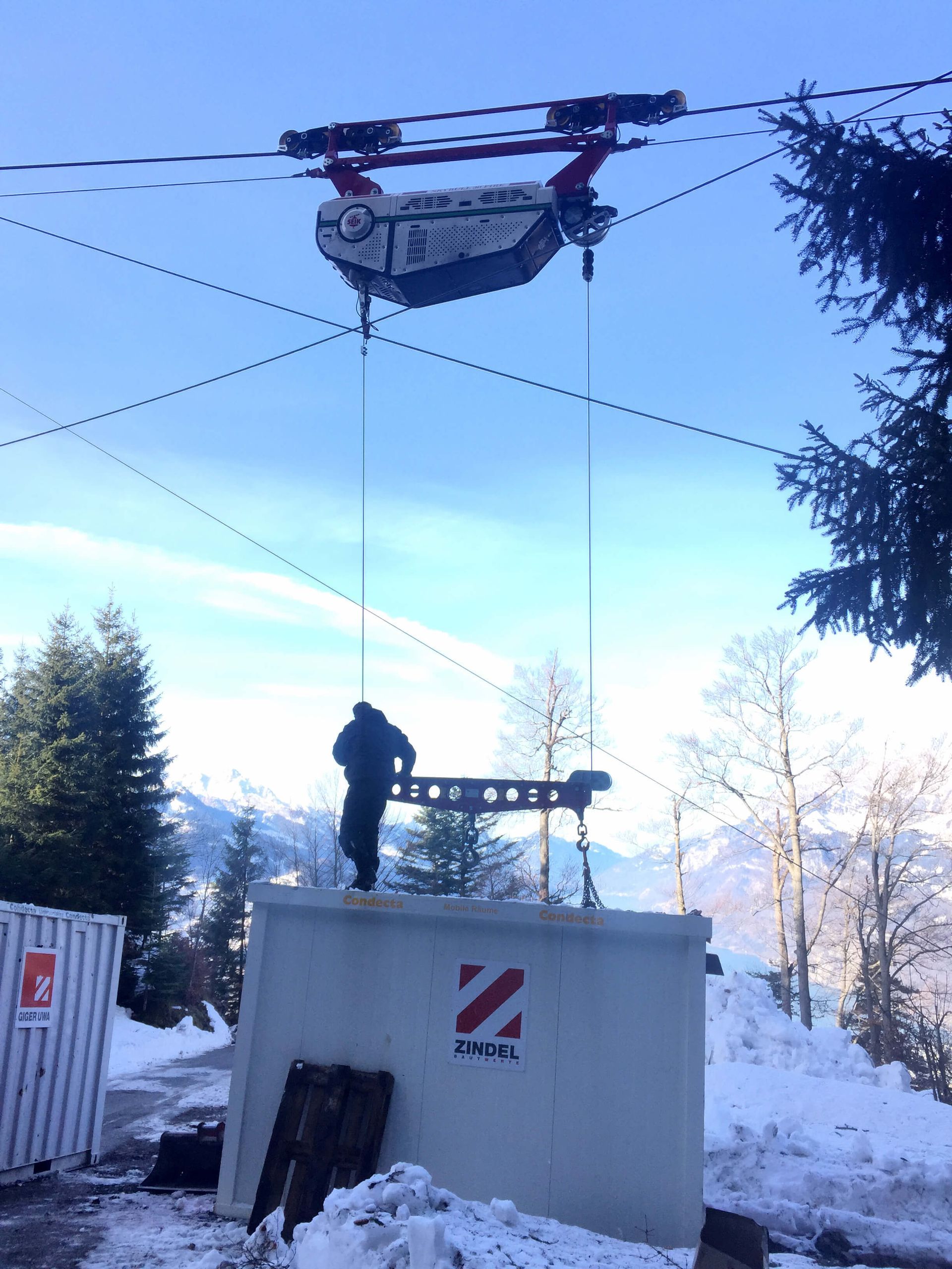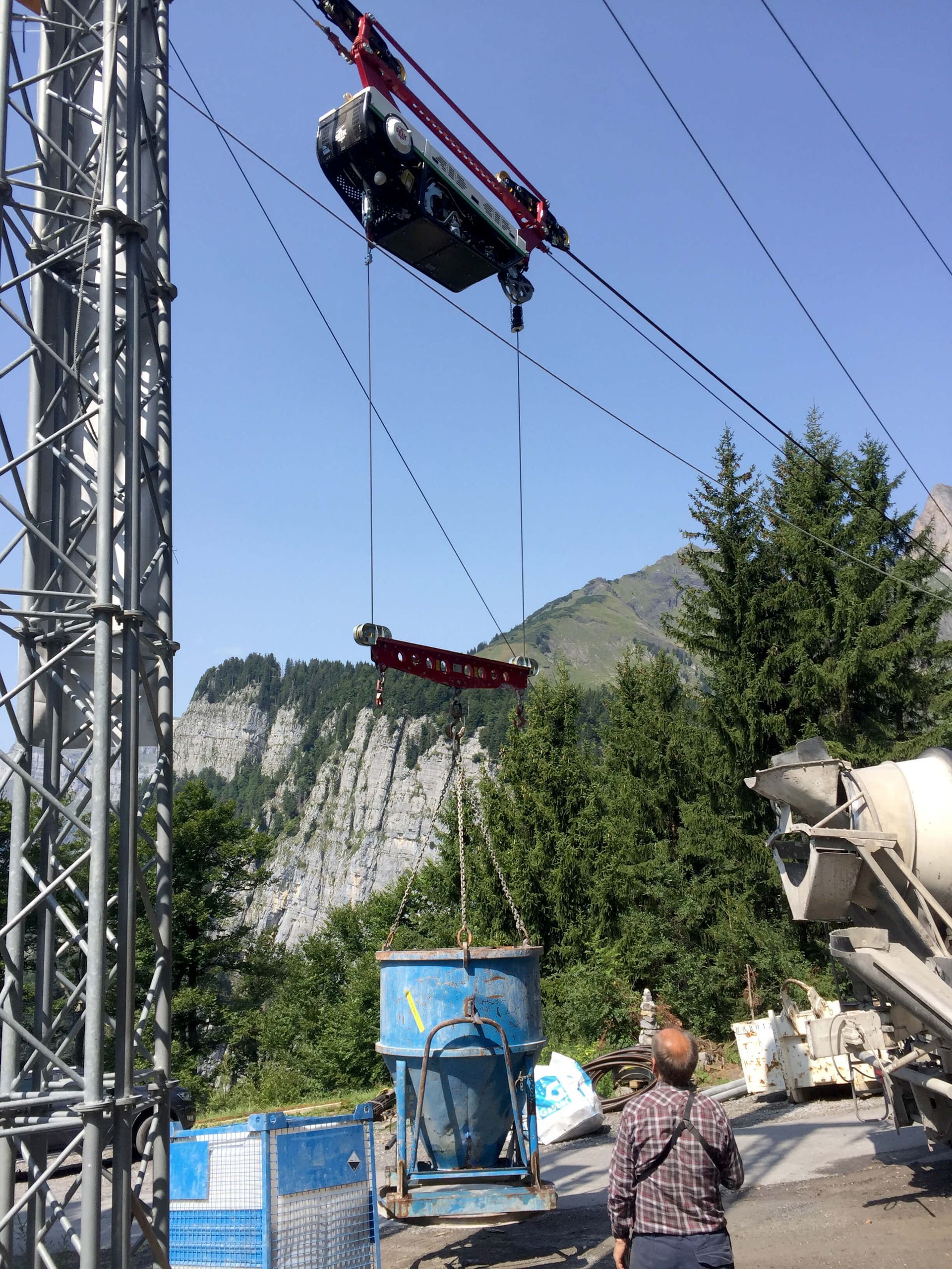 Um die Wasserfassung / Entsander zu bauen wurde eine Materialseilbahn erstellt, da keine Zufahrtstrasse in das steile Gelände gebaut werden konnte.