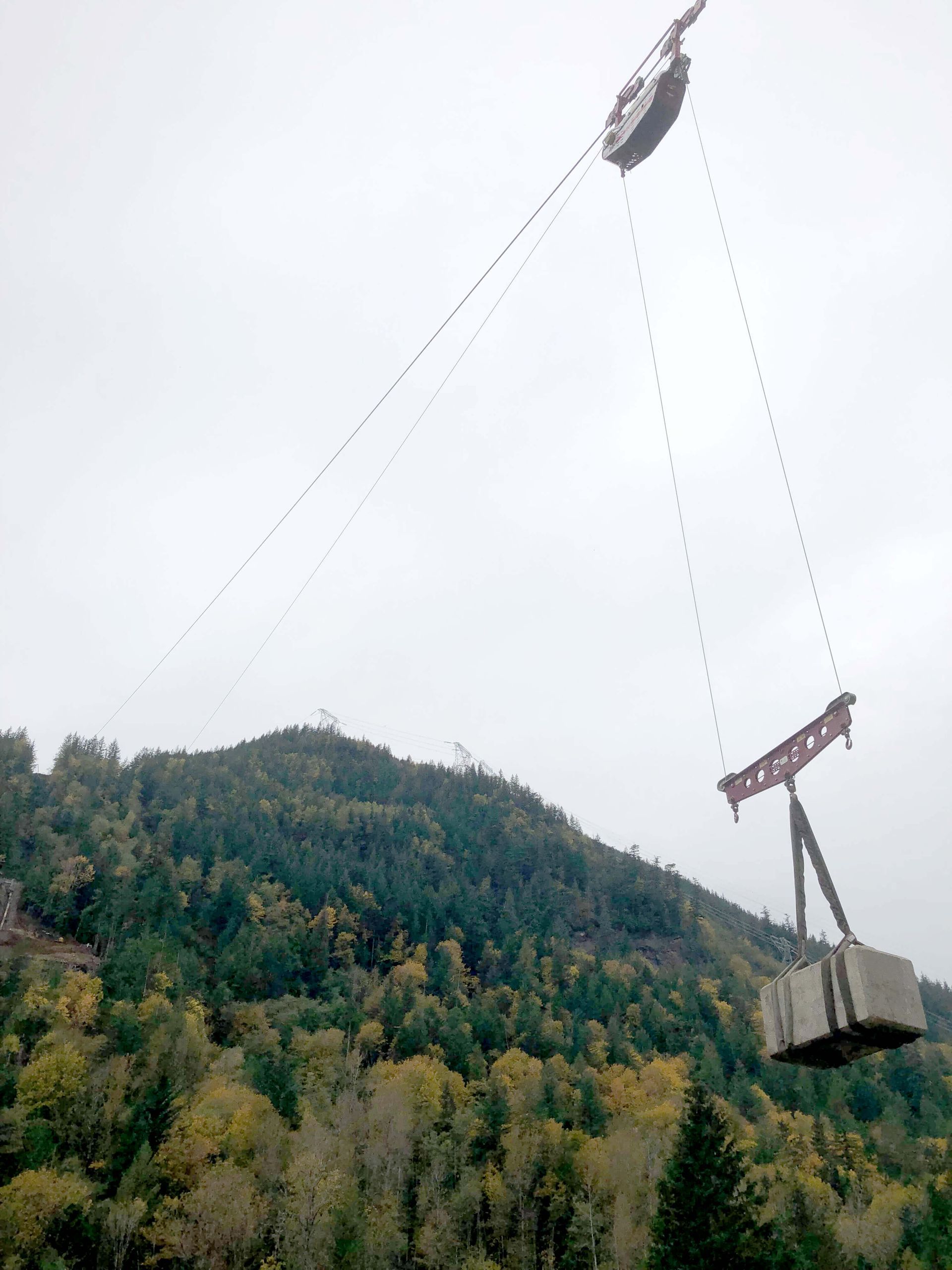 Mit der Seilbahn wurden die alten Rohre heraus genommen und die neuen Rohre wieder verlegt.