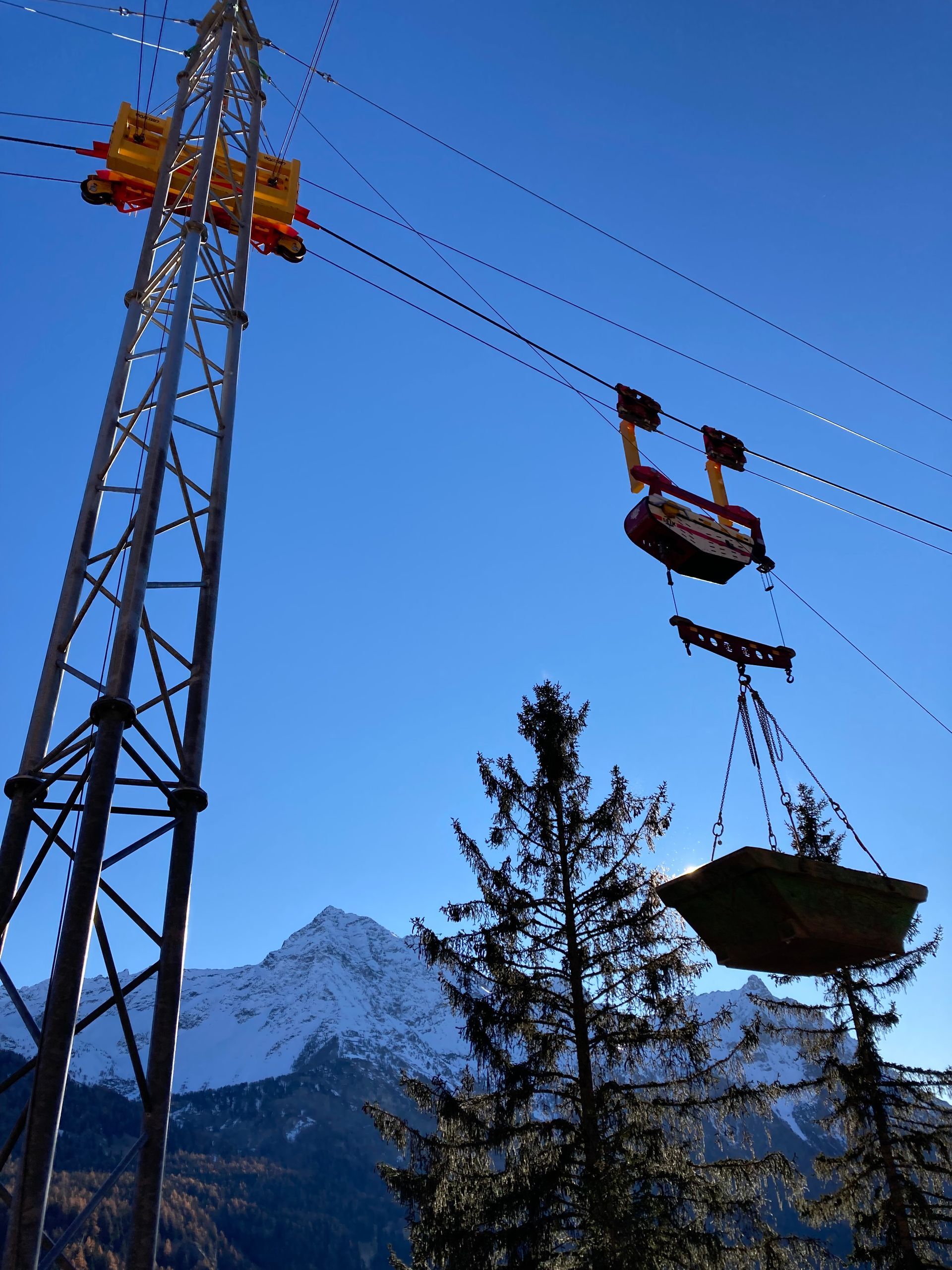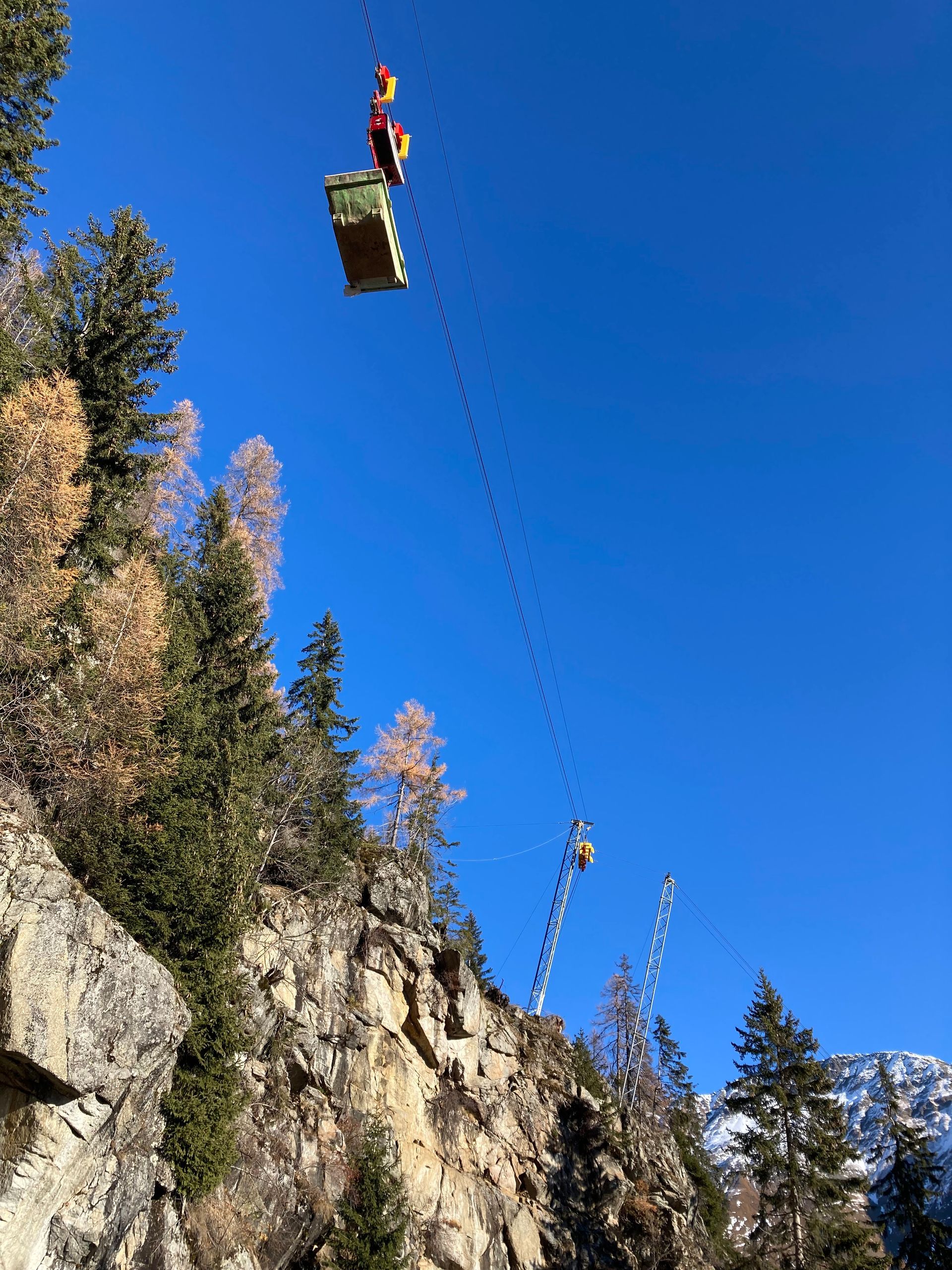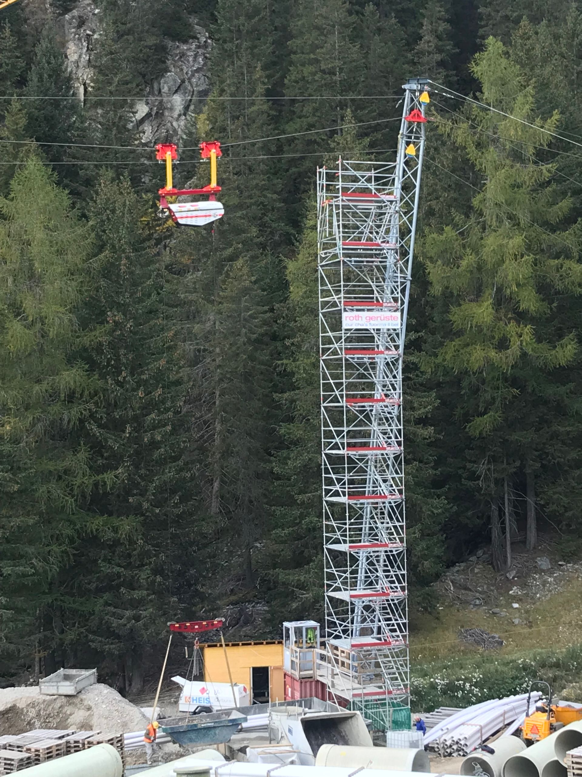 Für den Bau der Überleitung wurde eine Materialseilbahn gebaut mit einer einer Länge von 2 Kilometern welche horizontal dem Tal entlang verlief. Dabei mussten zwei Links- und zwei Rechtskurven gebaut werden mit einer Ablenkung von bis zu 17°.